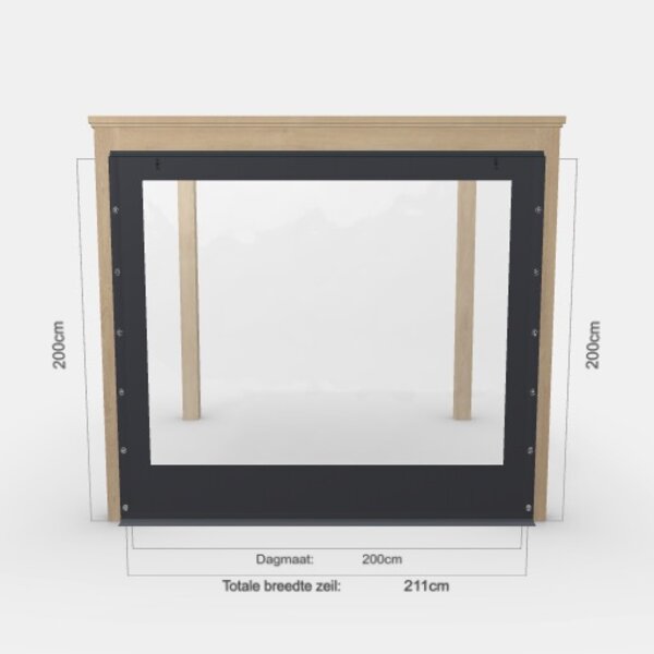 Options:Materiaal type: PVC Mat, Kies een kleur: PVC Mat Antraciet, Achtergrond veranda materiaal: Geïmpregneerd hout naturel, Breedte tussen palen (dagmaat) in cm: 200, Hoogte palen links (dagmaat) in cm: 200, Hoogte palen rechts (dagmaat) in cm: 200, Bevestiging zijkant: Tourniquet draaisluiting, Plaatsing zijde: Buitenzijde, Bevestiging bovenkant: Profiel tegen de wand, Kleur profiel(en): Profiel Antraciet, Aantal extra ritsen: geen, Raam onderkant, vanaf vloer in cm: 30, Opmerkingen: , rits2extra: nee, rits3extra: nee, rits2breedte: 200, rits3breedte: 200, hoogteLinksTTI: 200cm @size:1.00; @font:Arial;, hoogteRechtsTTI: 200cm @size:1.00; @font:Arial;, hoogteAddHidden: 400, hoogteSubHidden: 0, hoogteVerschil: 0, dominanteZijde: rechts, calc: 0, hoogteRechts: 100, raamInputMinimum: 0, totale breedte text: Totale breedte zeil: @size:1.00; @font:Arial;, Totale breedte tti: 211cm @size:1.00; @font:Arial;, Dagmaat text: Dagmaat: @size:1.00; @font:Arial;, horizontalDimension: 200cm @size:1.00; @font:Arial;, rits1Valid: 0, rits2Valid: 0, rits3Valid: 0, Rits1Pos: 1e rits 0cm @size:1.00; @font:Arial;, Rits2Pos: 2e rits 0cm @size:1.00; @font:Arial;, Rits3Pos: 3e rits 0cm @size:1.00; @font:Arial;