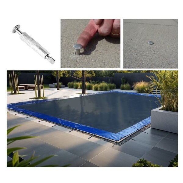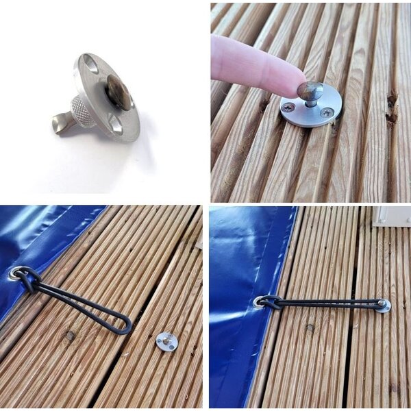 - RVS Zwembadplug: Voor de bevestiging van de rubber rekker kan het anker uit de plug omhoog getrokken worden. De rubber rekker van het winterzeil kan hierdoor rond het anker bevestigd worden. Als het anker niet wordt gebruikt ligt de rvs kop weer netjes gelijk met het terras.